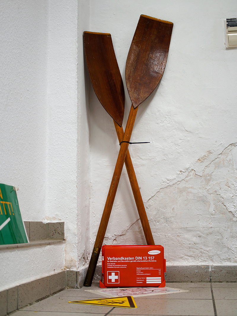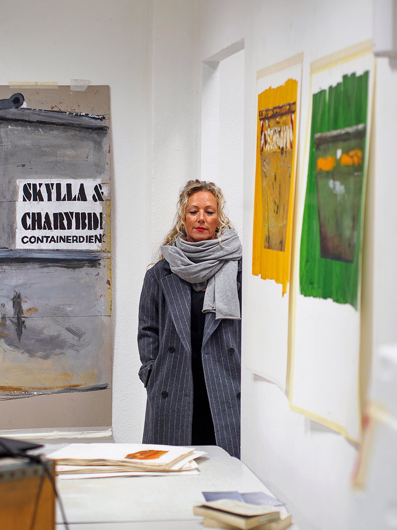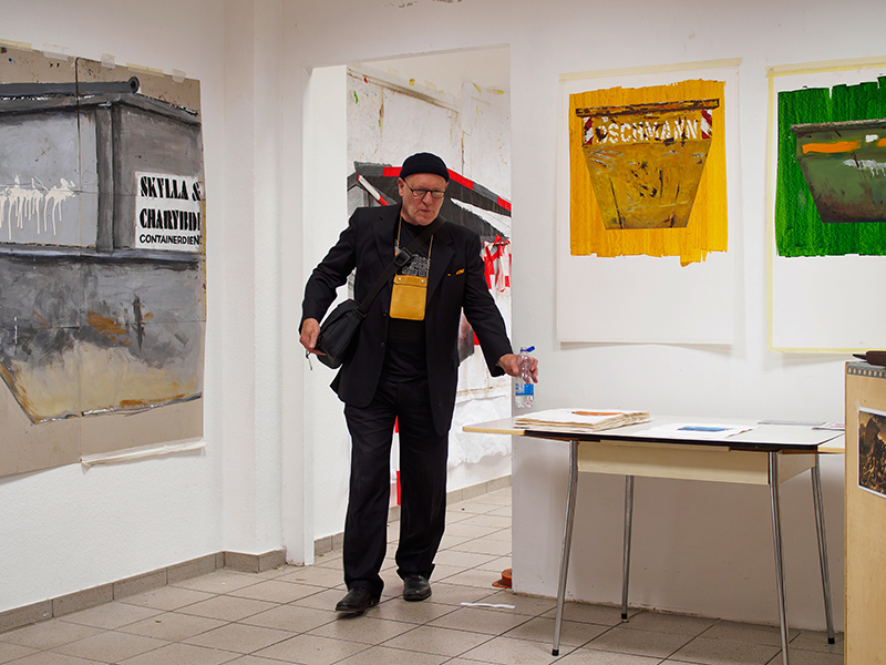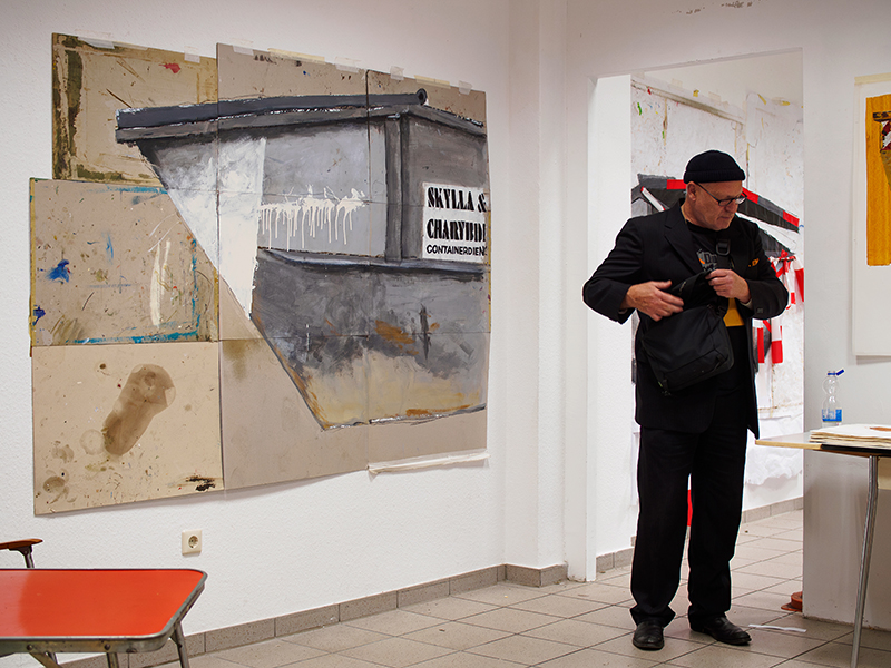 Wie die Container sind die Mythen der Antike für mich Zeichen des Übergangs. Sie sind Symbole der notwendigen Veränderungen – in unserem Leben. Ich habe viele Container gemalt und in der Ausstellung werden neben diesen Containerbildern auch Installationen, Projektionen und andere Arbeiten und Objekte zu sehen sein, die sich mit den Abenteuer und Irrfahrten unseres Helden beschäftigen.