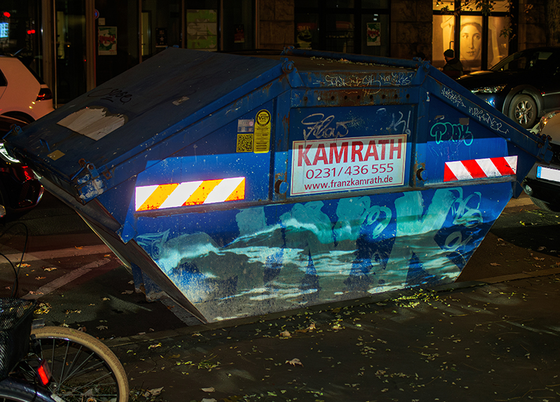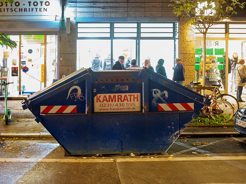 In Kooperation mit Dortmund Kreativ. Ein Projekt im Rahmen von KOMMEN BLEIBEN GEHEN – Kreative Projekte an temporären Orten. Mit freundlicher Unterstützung von Containerdienst Franz Kamrath GmbH. Mit Arbeiten von Peter Hoffmann, Bernd Leistikow und anderen Künstlern.